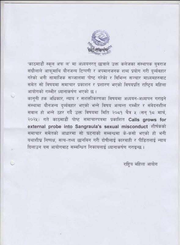 According to KSL, after publishing its admission notice, an English daily published a misleading article on Wednesday, June 25, 2025 (Ashar 11, 2082 BS), citing NWC Deputy Secretary Roshni Devi Karki and referencing an outdated and debunked issue. KSL believes this was a strategic move to negatively influence the new admission process.