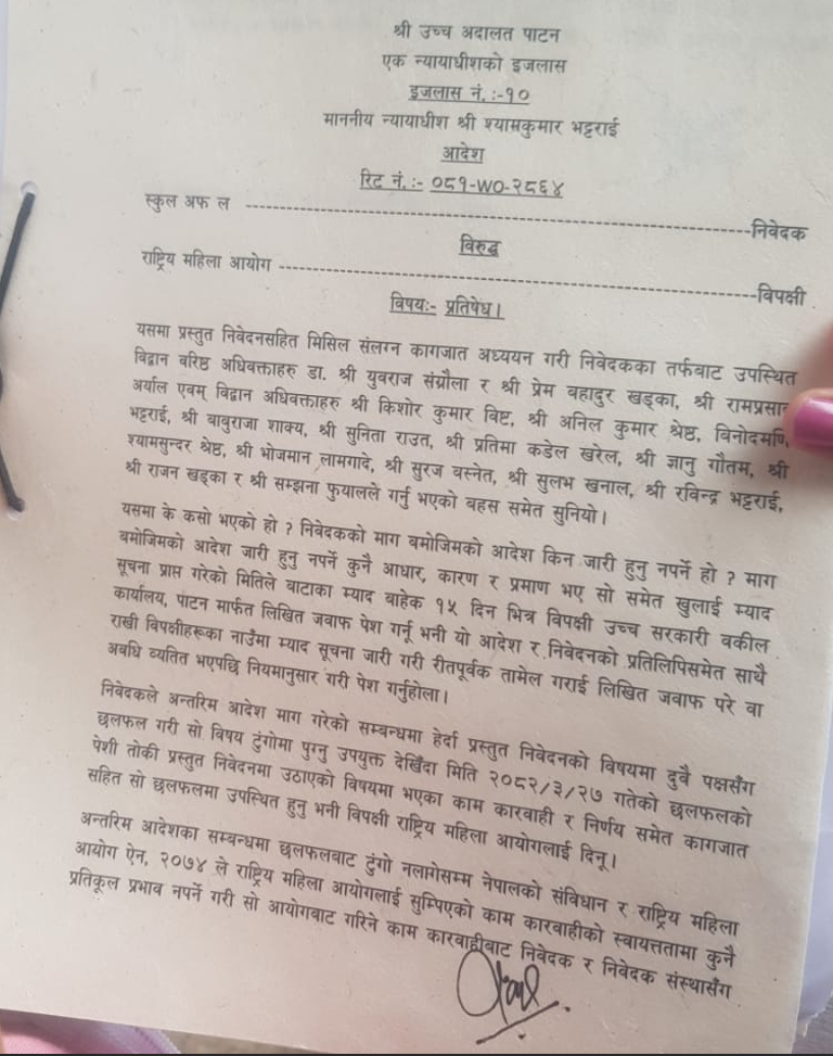 The Patan High Court has issued an interim order to the National Women’s Commission (NWC), which has been used as a tool by vested interest groups to spread rumors against Kathmandu School of Law (KSL). The order states, "Do not disseminate or cause to be disseminated any information or details that could negatively impact the personal reputation of individuals associated with the institution (KSL) or the institutional credibility of KSL."